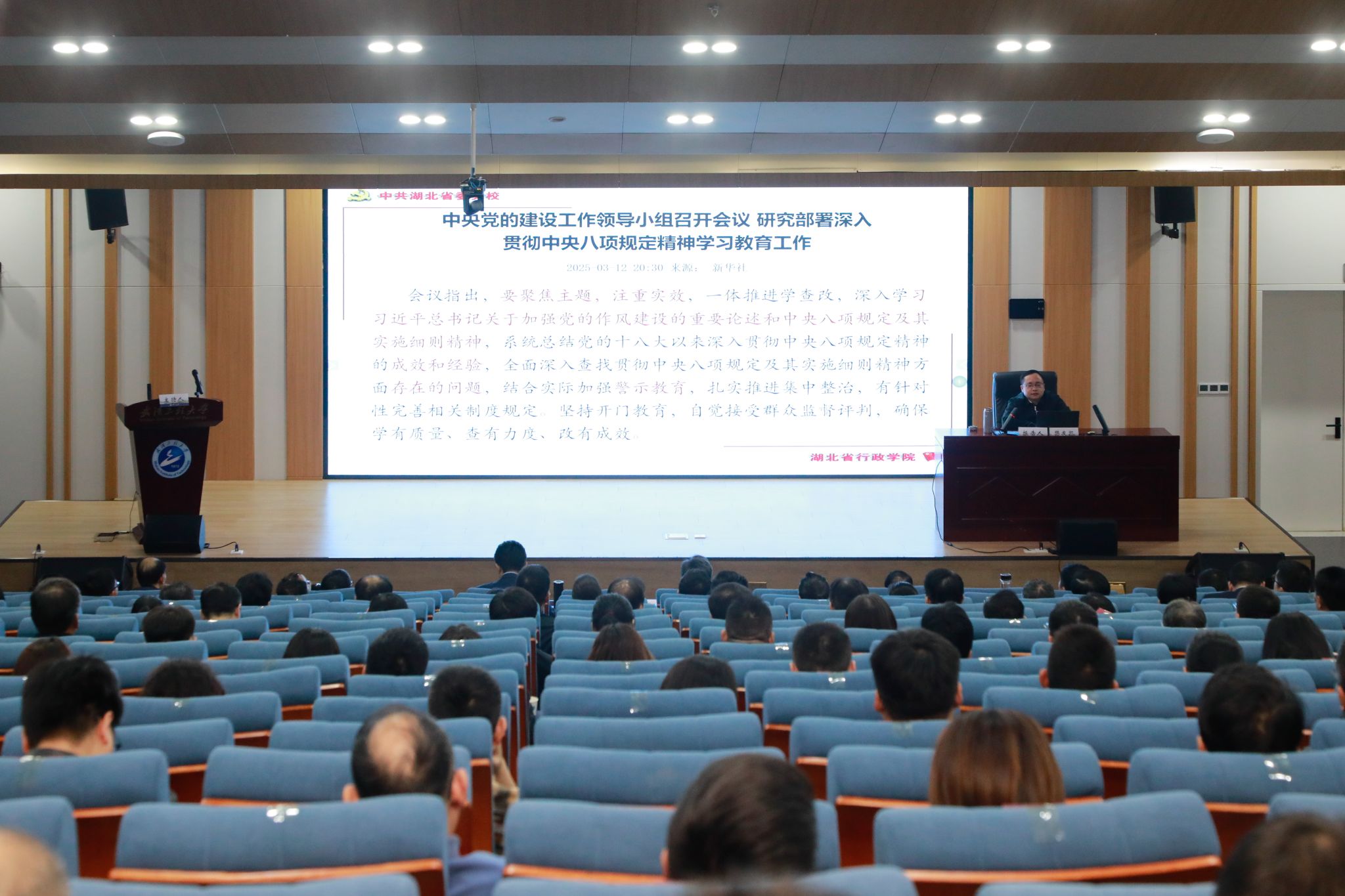 本网讯(通讯员 周雯琪 谭明武)3月27日下午,学校在教育教学综合楼102报告厅举行深入贯彻中央八项规定精神学习教育读书班专家辅导报告会。中共湖北省委党校樊友凯教授应邀作辅导报告。校党委书记汪伟,校党委副书记、校长张彦铎,校党委副书记李志旭,校纪委书记、监察专员方文海,校党委常委、副校长朱青林,校党委常委、副校长喻发全,校党委常委於世为出席报告会。报告会由校党委常委、副校长、组织部部长马小龙主持。