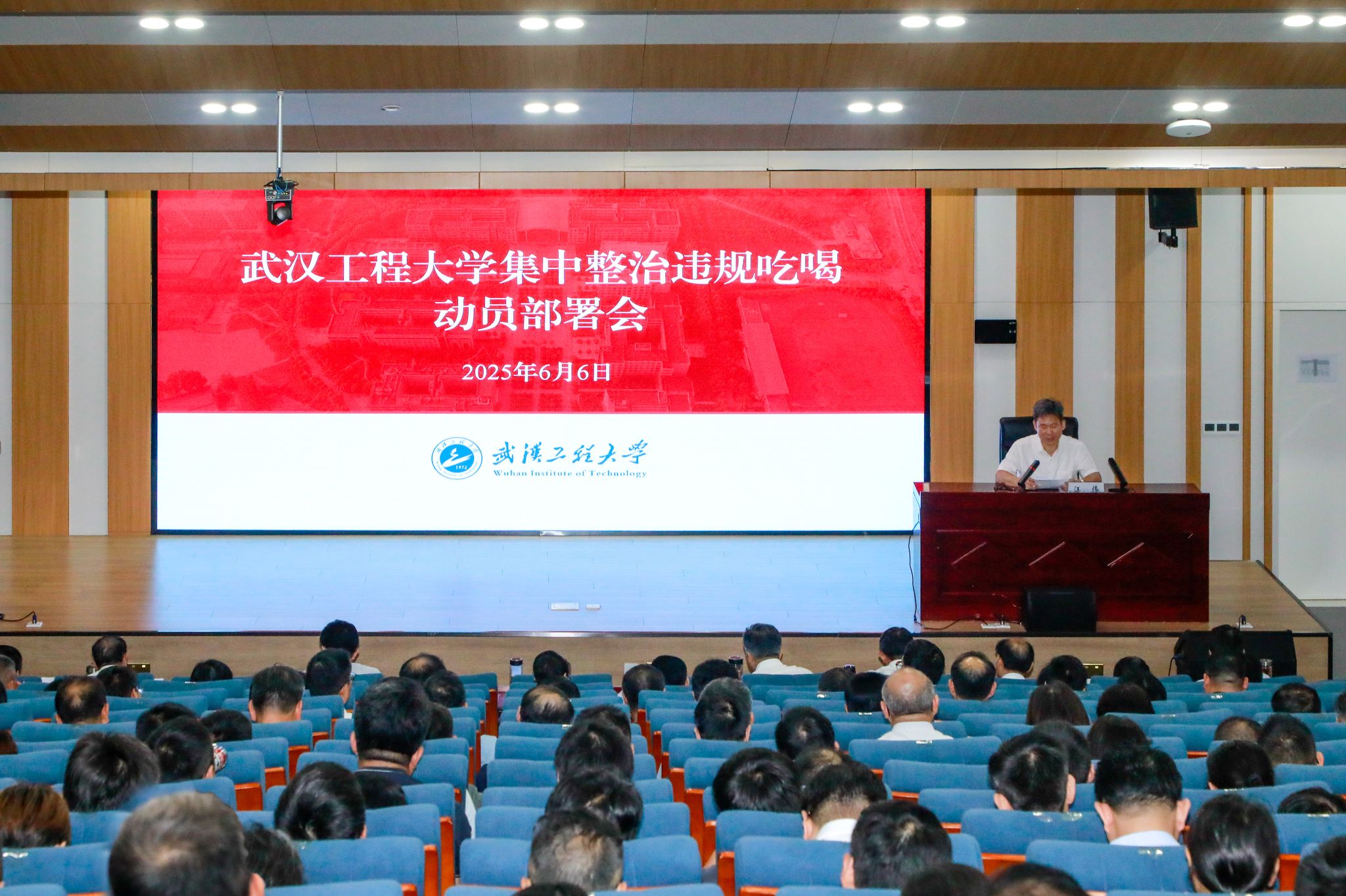 本网讯(通讯员 谭明武 王祥礼)6月6日上午,学校在教育教学综合楼102报告厅召开集中整治违规吃喝动员部署会。全体校领导,全体中层干部,新提拔干部、年轻干部、关键岗位人员参加会议。校党委书记汪伟作动员部署讲话。校党委副书记、校长张彦铎主持会议。