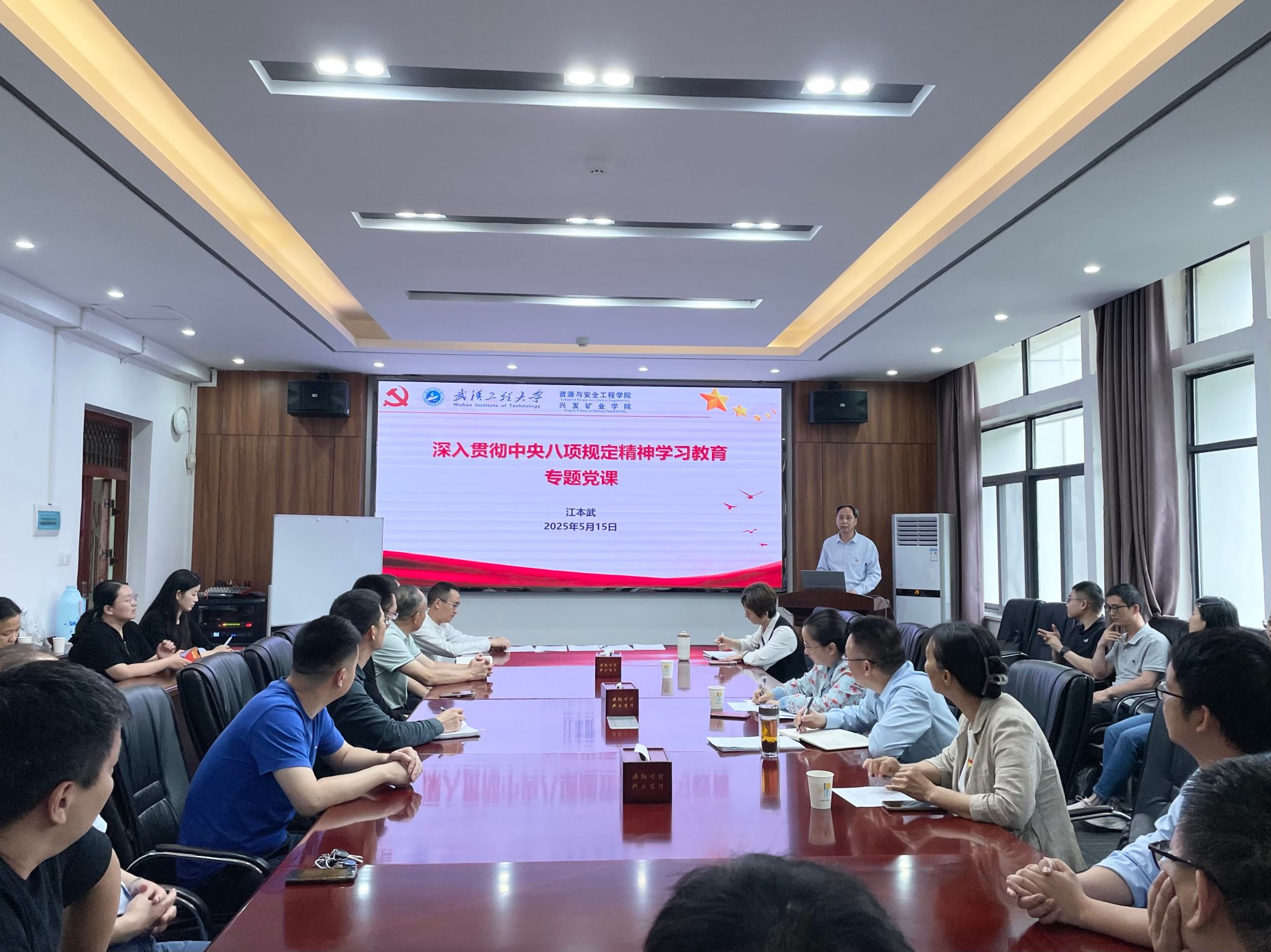 本网讯(通讯员 黄橙)5月15日下午,兴发矿业学院资源与安全工程学院党委书记江本武为学院全体教职工讲授深入贯彻中央八项规定精神学习教育专题党课,学校学习教育工作专班成员机关党委书记郭昕、组织员刘汉红参加了本次专题党课学习。